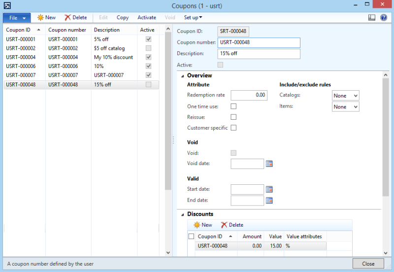 To create a coupon, in Microsoft Dynamics AX for Retail click: Call center > Setup > Coupons > Coupons. In the Coupons form, click New.