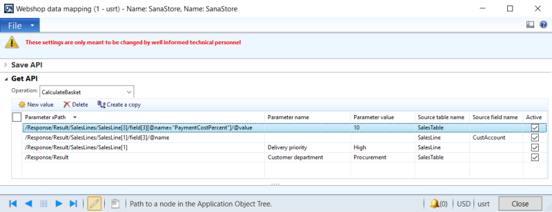 Usually the sales order data coming from the Sana webshop is saved to the relevant Sana fields in the sales order table in Microsoft Dynamics AX. Using Webshop data mapping, you can save the sales order data to a different field from the sales order table or to a field from a different table.