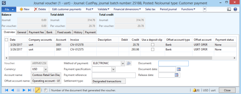 When the payment journal has been created, an accountant can post the journal in Microsoft Dynamics AX, or it can be posted automatically, to capture the payment in the journal against the invoice.