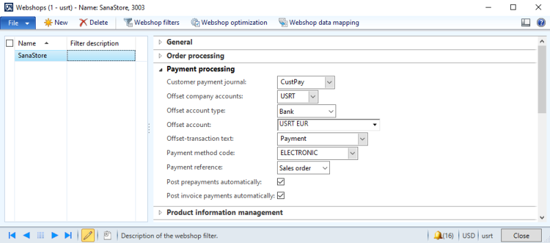 To accept invoice payments from a Sana webshop, in Microsoft Dynamics AX click: Webshop > Common > Webshops. Select the webshop and set up the Payment processing settings. These settings are used to create a payment journal in Microsoft Dynamics AX, when a customer pays the invoice, and to post the payment transaction to a certain account.