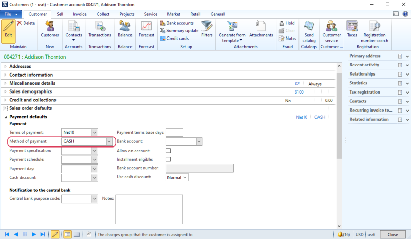 To assign the payment method to the customer, open the Customers form and use the Method of payment field on the Payment defaults FastTab.