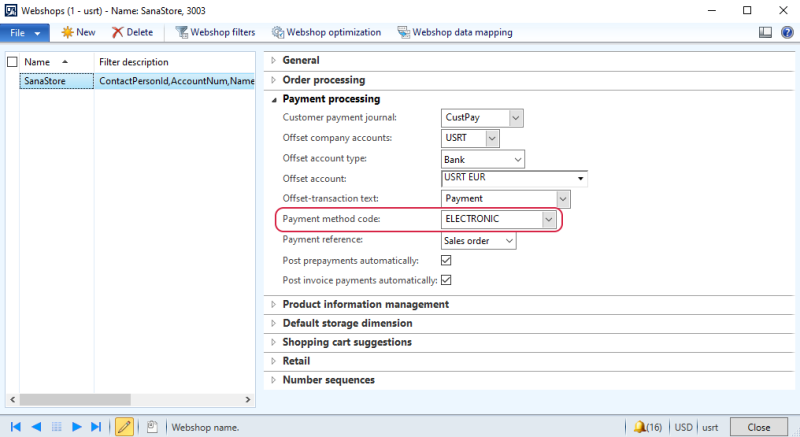 To assign the payment method to the webshop, open the Webshops form and use the Payment method code field on the Payment processing FastTab.