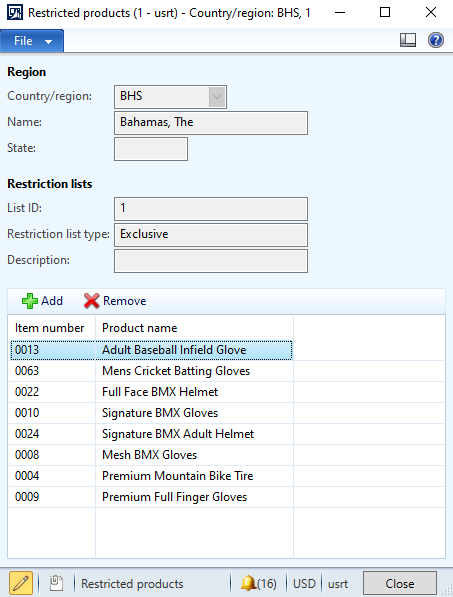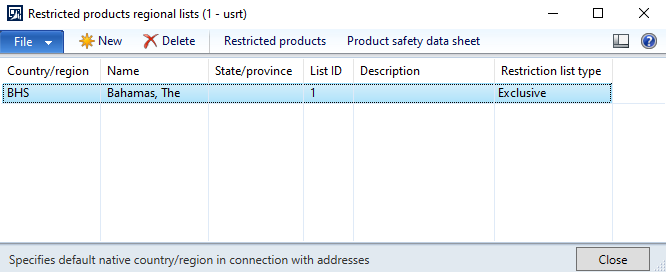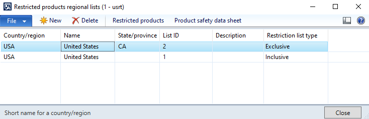 For more information, read the official Microsoft Dynamics AX documentation: Create a Restricted Products Regional List for a Country or Region and Create a Restricted Products Regional List for a State or Province.