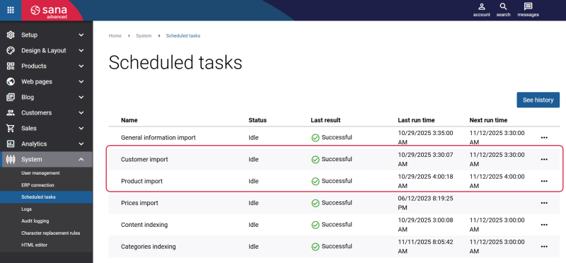 Sana Commerce Cloud uses scheduled tasks to synchronize data with your ERP system and to apply any changes made in ERP to your webshop.