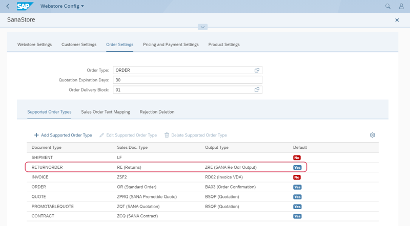 On the Supported Order Types tab, map the return order sales document type to the existing in SAP sales document type. Enable the Default option for return orders. For more information, see Supported Order Types.