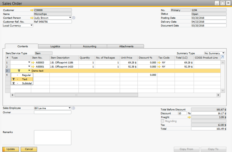 Sana does not support sales order lines of the text type. If you manually add such line to the sales order in SAP Business One, it will not be shown in the sales order details in the Sana web store. Only the items purchased by the customer are shown.