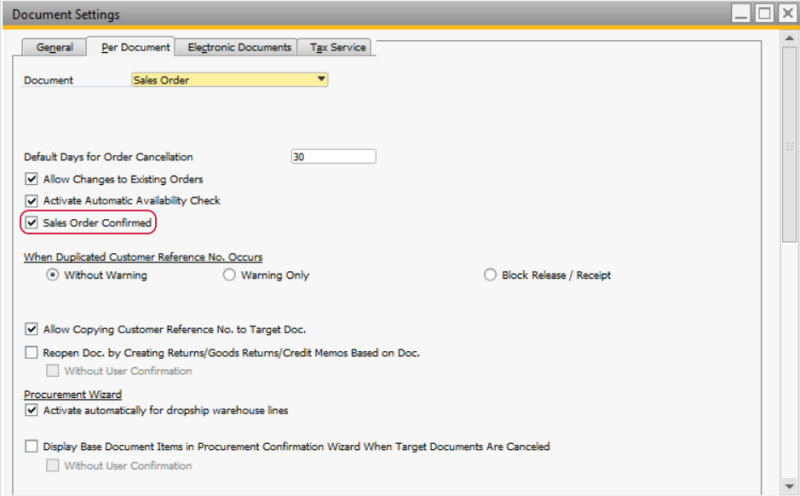 Open the Per Document tab. In the Document field select Sales Order and use the Sales Order Confirmed checkbox.