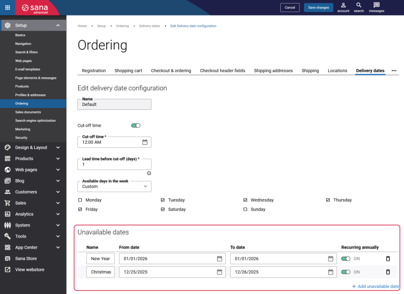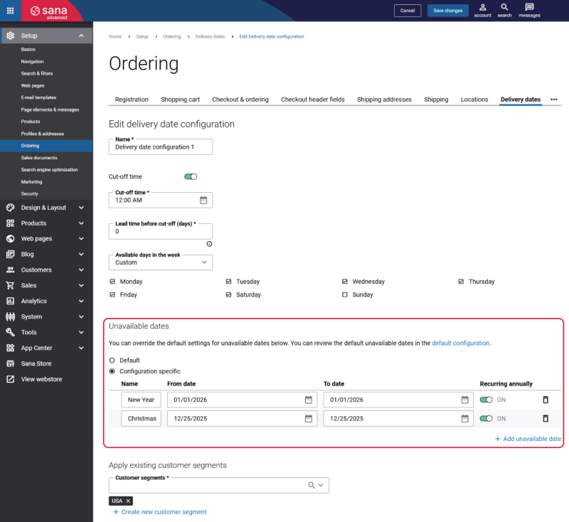 We have enhanced the Delivery dates feature to provide greater flexibility in managing unavailable dates. Previously, unavailable dates could only be configured globally for all delivery date configurations. This made it difficult to account for differences in public holidays, working days, or schedules across countries, regions, or customer segments. To address this, we have added the ability to configure unavailable dates for different delivery date configurations and different customer segments, allowing businesses to better reflect local conditions and meet customer needs.