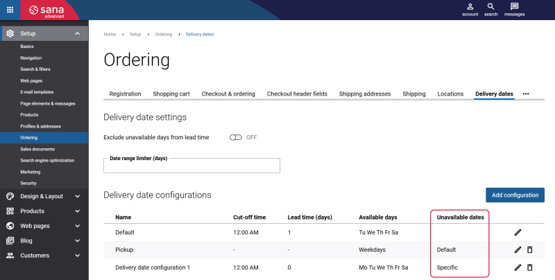 A new Unavailable dates column has been added to the delivery date configurations overview on the Delivery dates tab.