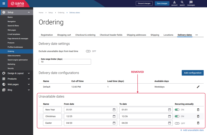 The Unavailable dates section, which was previously located on the Delivery dates tab and used for global configuration, has been removed from this tab.
