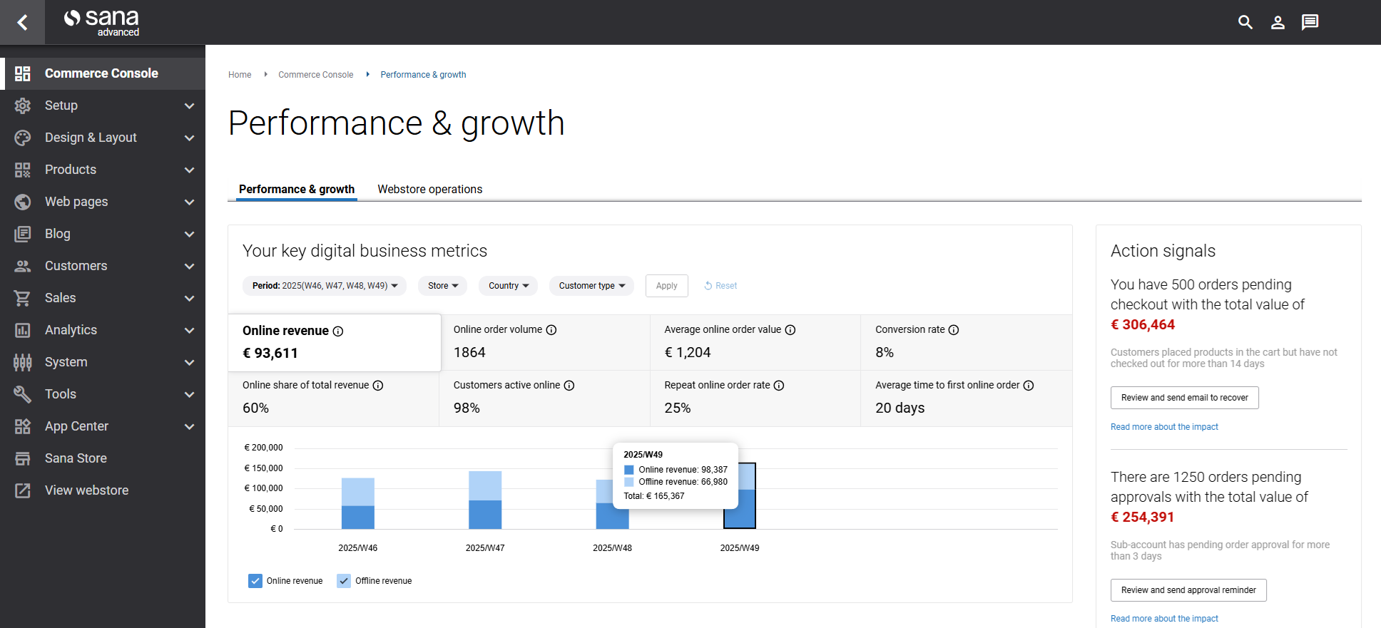 The Commerce Console brings together key performance data and actionable insights in one place, replacing the need to navigate multiple reports and dashboards. Built on a flexible, widget-based framework, it connects online and offline data to show how your Sana webstore contributes to total business growth and where to focus your efforts next.