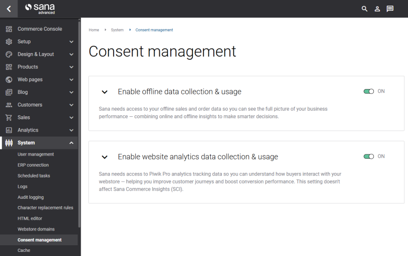 The Consent Management page in Sana Admin centralizes all data permissions needed for full reporting accuracy. System administrators can enable or restrict access to offline ERP data and web analytics data, which directly affects what appears in the Commerce Console metrics and buyer widgets.