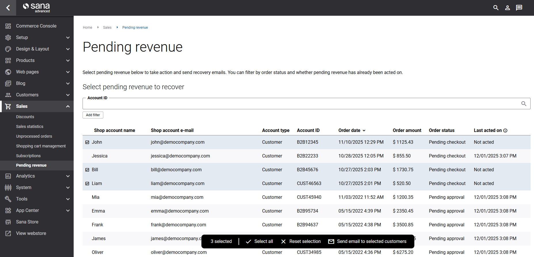 The Pending Revenue page in Sana Admin shows orders that are at risk of being lost due to cart abandonment or delayed approvals. From here, e-commerce managers can quickly follow up with customers by sending reminder e-mails to recover potential income.