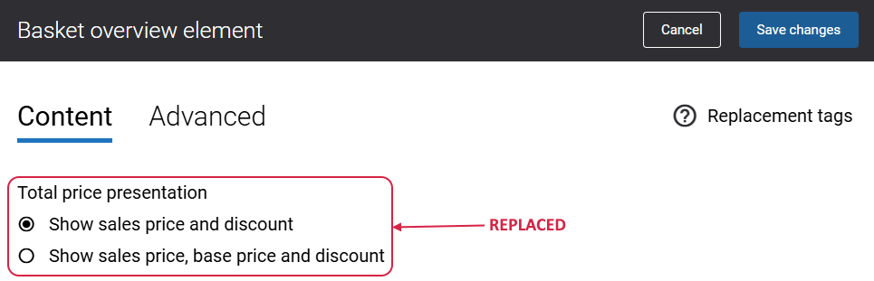 - Reworked price presentation settings: Removed the Total price presentation settings from the Basket overview content element.