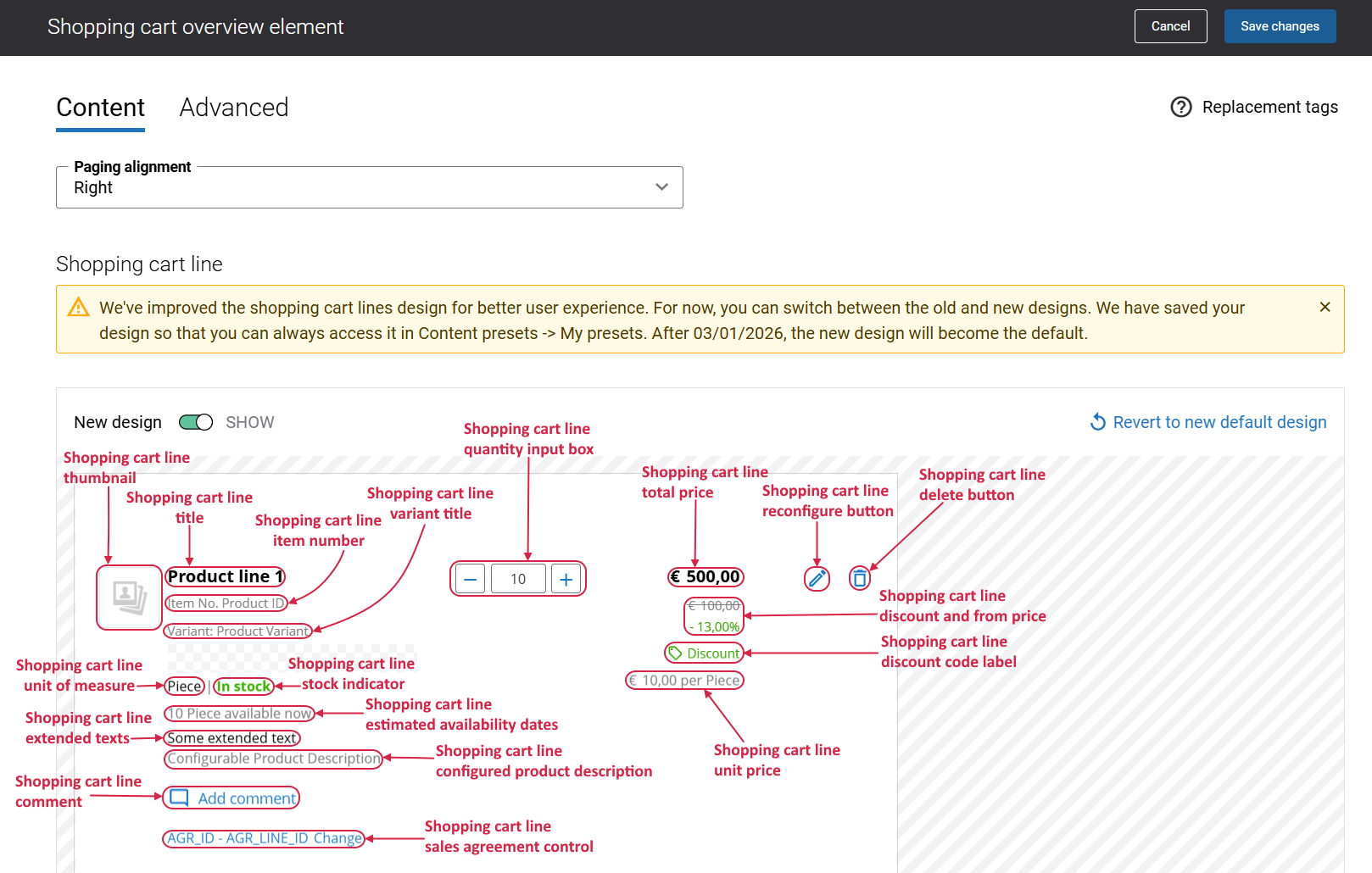 A new shopping cart lines editor is now available in the Shopping cart overview content element, allowing you to control how the shopping cart lines appear in your webstore, including the placement of thumbnails, prices, discounts, UOM, and more.