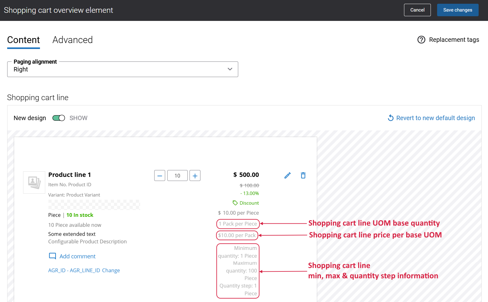 In an earlier release, we introduced the ability to edit shopping cart lines using visual designer. With this release, we’ve further extended this functionality by adding new content elements that provide more flexibility and transparency in the shopping cart overview.