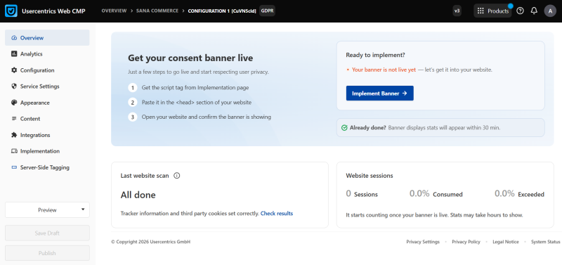 Previously, Sana Commerce Cloud supported Usercentrics Web CMP v2. With this release, support has been extended to Usercentrics Web CMP v3, enabling customers to use the latest version of Usercentrics for consent management on their webstores.