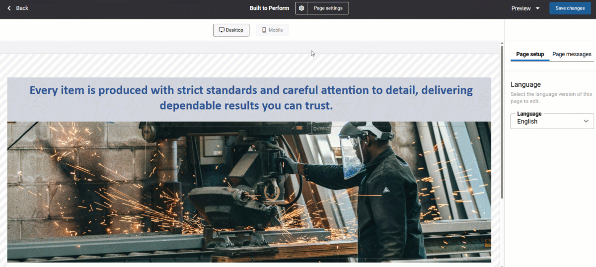- The Desktop and Mobile tabs have been repositioned to the top of the page, below the toolbar, and are now presented as buttons. This allows switching between desktop and mobile layouts as before, with each layout configurable independently.