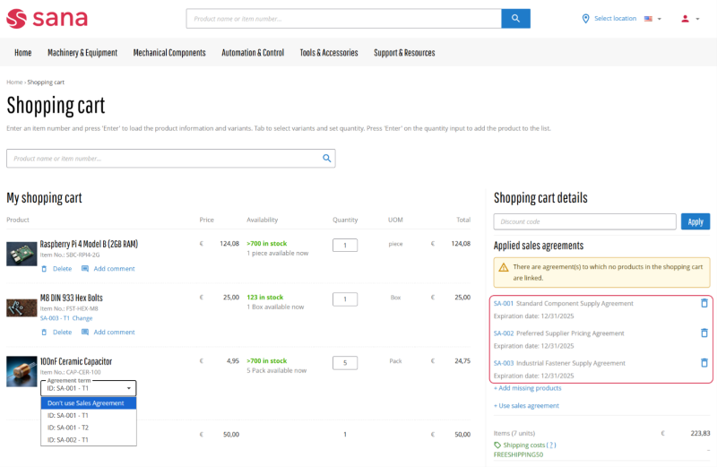 We’ve improved the sales agreement functionality in Sana Commerce Cloud for Microsoft Dynamics 365 Business Central. Previously, customers could only apply one sales agreement per order. With this release, customers can now create a single order that includes products linked to multiple blanket sales orders. This change streamlines the purchasing process, allowing customers to apply all relevant agreements in one seamless checkout flow, ensuring correct prices and terms without the need for multiple orders or offline communication.