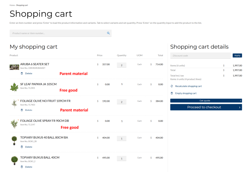 As a result, the free goods will now be visually grouped with their parent material in the shopping cart, checkout, and order confirmation e-mails, providing a clearer and more intuitive experience for customers, because earlier free goods were always displayed at the end of the list in the shopping cart. Now, they appear directly below their associated parent material.