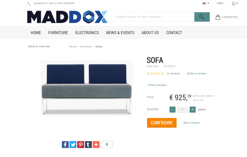 When a customer clicks on the Configure button on the product details page in the Sana webstore, the e-Con Product Configurator will open. There a user will be able to configure a custom product depending on the e-Con model assigned to it.