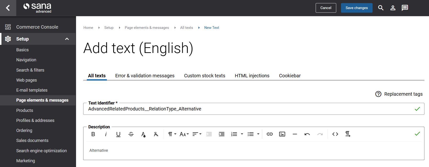 Step 1: In Sana Admin, go to Setup > Page elements & messages. On the All texts tab, click Add text.