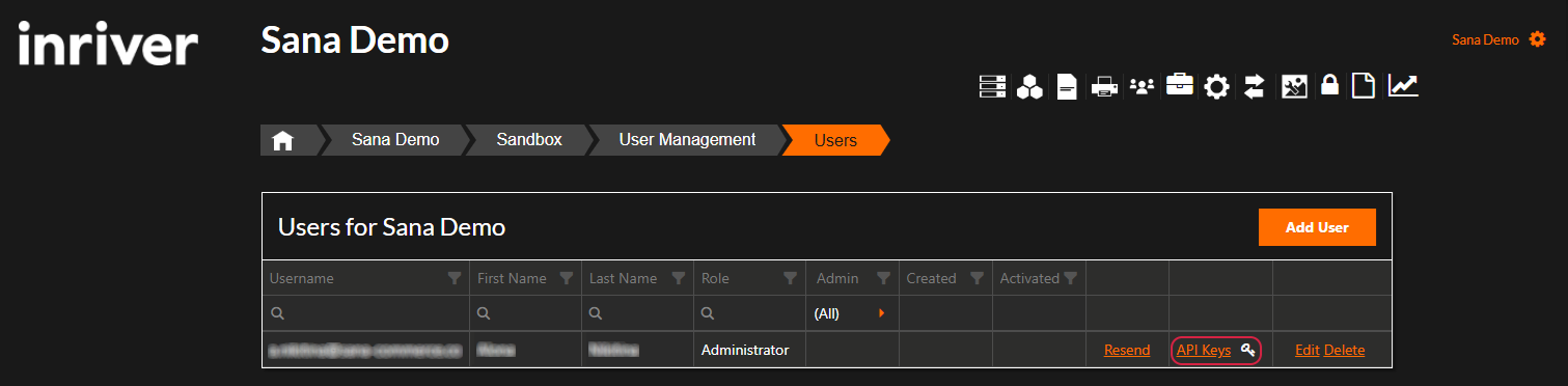 You can find the user credentials in the inriver Control Center in the User Management module. You can use an existing inriver user or create a separate user dedicated exclusively to Sana. This user must have at least View permissions. For more information on how to configure the API key, see Configure inriver Remoting API Key. |