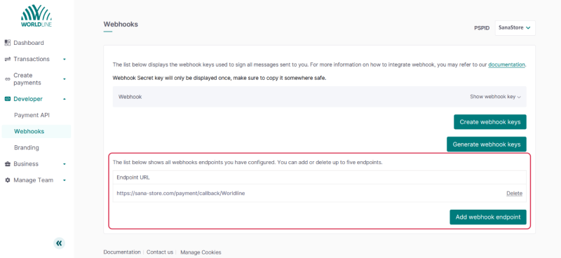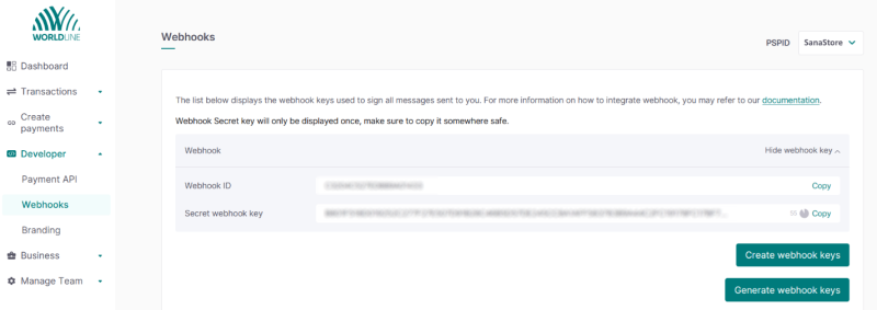 Step 2: In the Worldline Merchant Portal click: Developer > Webhooks. Generate the Webhook Keys. Copy the Webhook ID and Secret webhook key and insert them on the Worldline configuration page in Sana Admin.