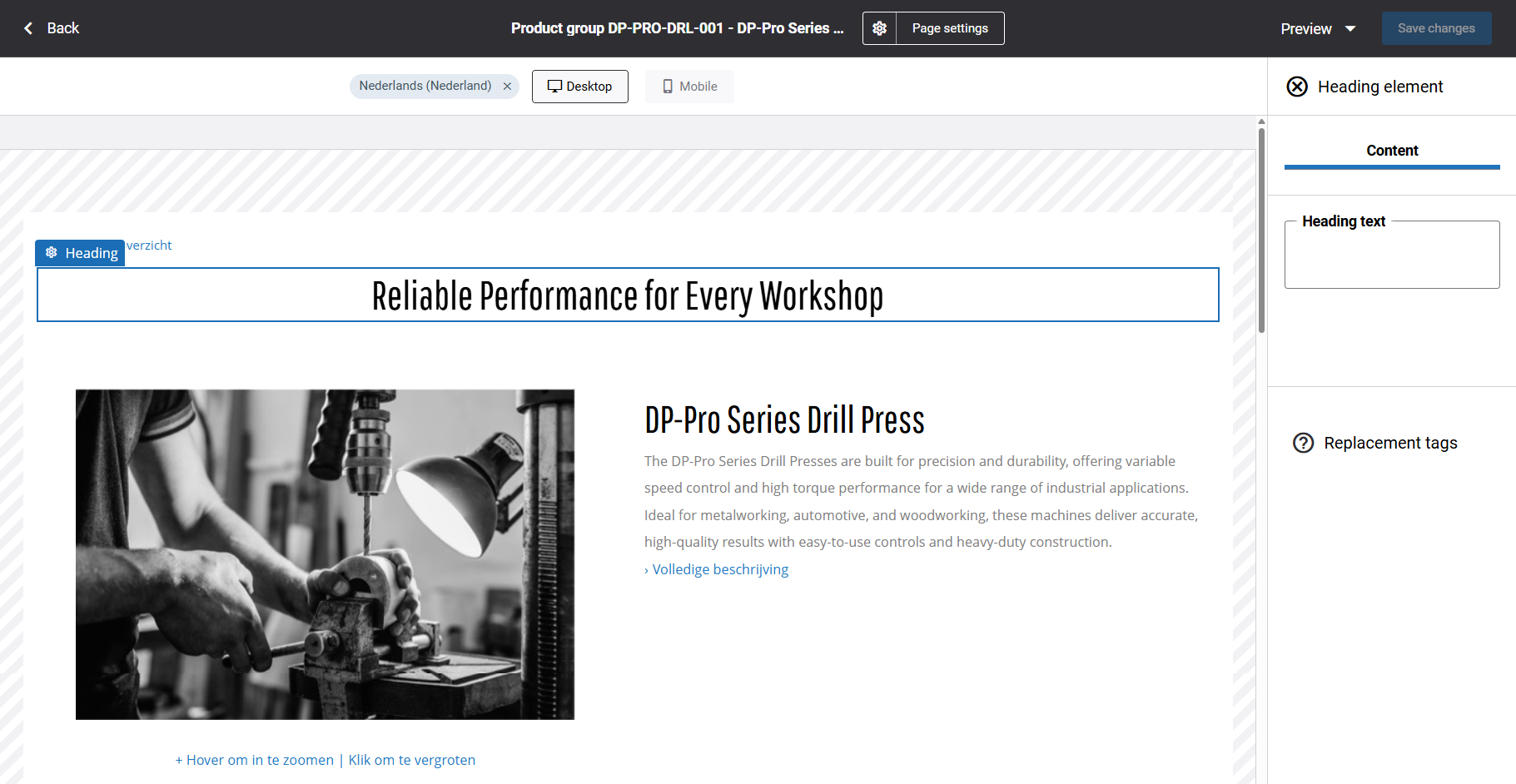 If you add content elements to a product group page, you can also translate them into other languages. Switch from the default language to the one you want to work with, then select the content element in the visual designer. The editable fields for that element will appear in the right-hand panel, where you can provide the text for the selected language. Not all content elements can be translated.