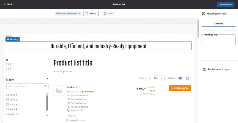 If you add content elements to a product list page, you can translate them into other languages. Switch from the default language to the one you want to work with, then select the content element in the visual designer. The editable fields for that element will appear in the right-hand panel, where you can provide the text for the selected language. Not all content elements can be translated.
