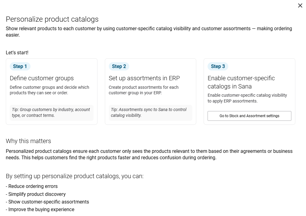 Personalize product catalogs: Show relevant products to each customer using customer-specific catalog visibility and customer assortments. This simplifies ordering and improves user experience.