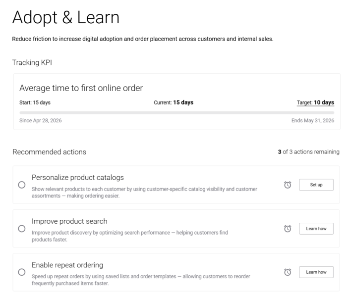 This success track focuses on reducing friction to increase digital adoption and order placement across customers and internal sales.