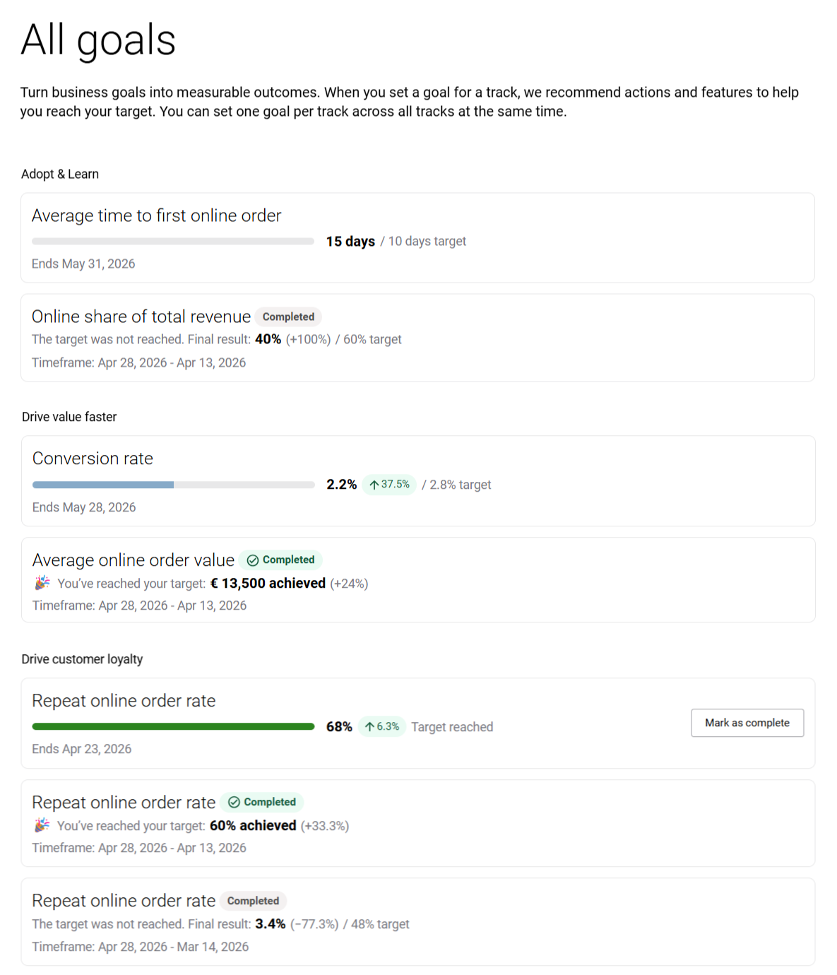 Goals are time-bound and tied to specific key performance indicators (KPIs). Customer success managers (CSMs) help define these goals and ensure they align with meaningful business improvement areas in Sana Commerce Cloud.