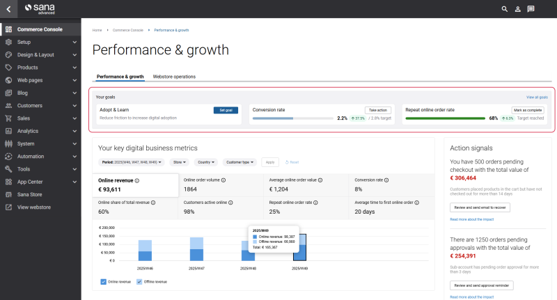 The Success plan widget helps e-commerce managers turn digital ambitions into a clear, guided path toward measurable growth. Built into the Commerce Console in Sana Admin, it brings together goals, progress tracking, and recommended actions in one place. Instead of managing digital initiatives through scattered tools or conversations, teams can quickly see where their e-commerce channel stands and where to focus next, select structured success tracks, define measurable targets, and monitor progress directly within the platform, turning digital commerce into a structured journey toward continuous improvement.