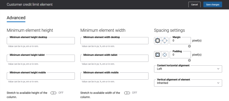 To add the Credit limit widget to any page of the Sana webstore, use the Customer credit limit content element in Sana Admin. You can add this widget to any page. However, we recommend placing it on the My Account page or on any other dedicated page.