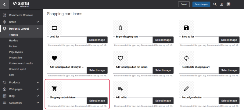 The Miniature shopping cart icon can be changed in Themes. In Sana Admin click: Design & Layout > Themes. Click Edit on your webstore theme and open the Icons tab. In the Shopping cart icons section, find the Shopping cart miniature icon. You can change the default icon.