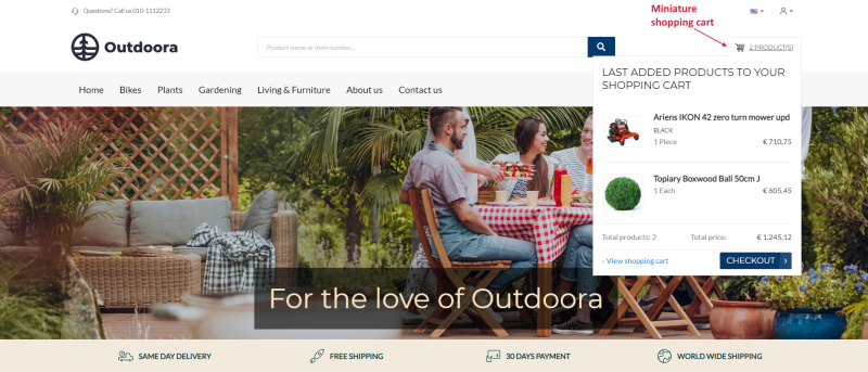 The Miniature shopping cart content element is used to add shopping cart miniature to the webstore header for the desktop and tablet layouts. Customers can see the shopping cart icon and the number of products in the shopping cart. They can click on it to open the shopping cart. When customers hover over it, they can see the first three products in the shopping cart, total price, and the Checkout button.