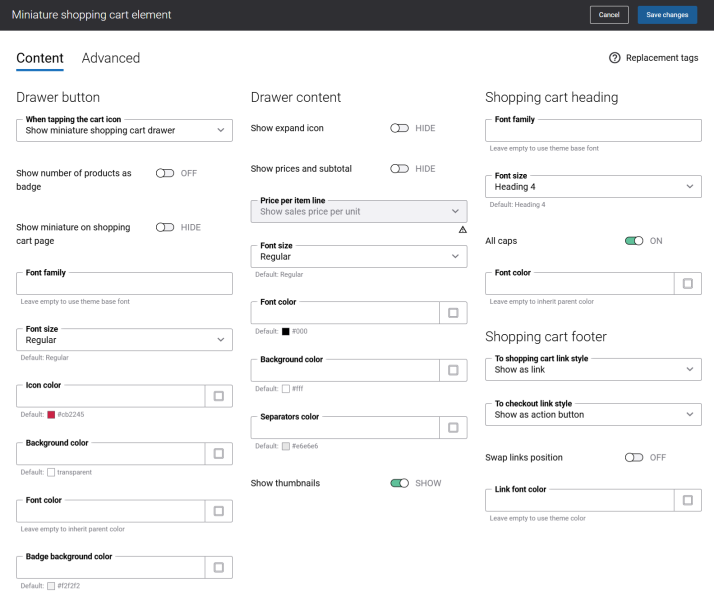 On the Advanced tab of the Miniature shopping cart content element, you can configure height, width, and spacing settings.