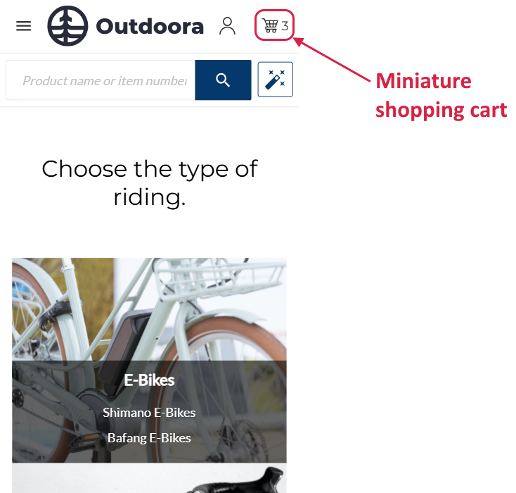 The Miniature shopping cart content element is used to add shopping cart miniature to the webstore header for the mobile layout. Customers can see the shopping cart icon and the number of products in the shopping cart. They can tap on it to open the shopping cart.