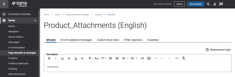 In Sana Admin click: Setup > Page elements & messages. To find the necessary text, on the All texts tab, search for Product_Attachments ID. Here you can change the default text of the Product attachments content element.