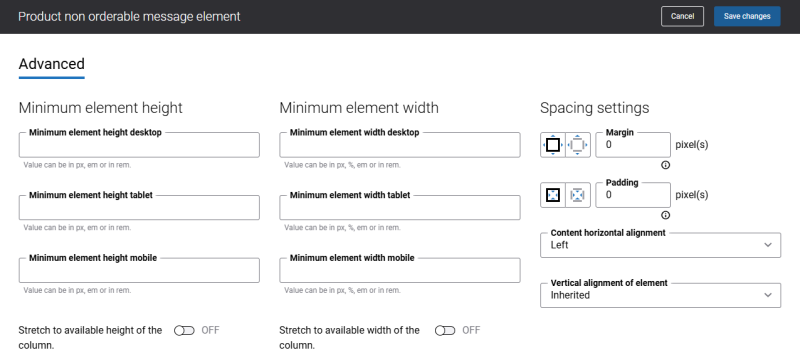 On the Advanced tab of the Product non orderable message content element, you can configure height, width, and spacing settings.