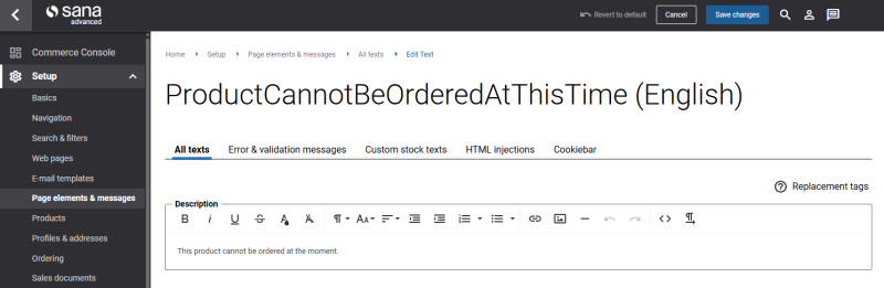 In Sana Admin click: Setup > Page elements & messages > All texts. You can change the text for a product or a product variant. To change the product text, search for ProductCannotBeOrderedAtThisTime ID. To change the product variant text, search for ProductVariantCannotBeOrderedAtThisTime ID. Then click Edit.