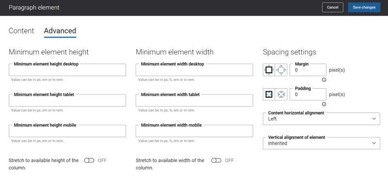 On the Advanced tab of the Paragraph content element, you can configure height, width, and spacing settings.