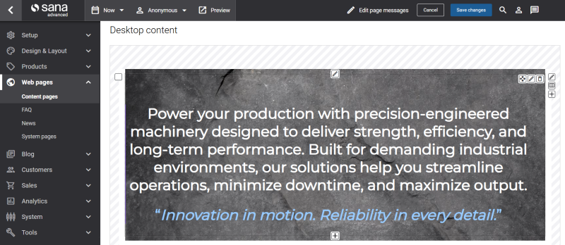 The Paragraph content element can be added to a content page, product page, product list page and system pages in Sana Admin.