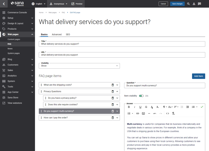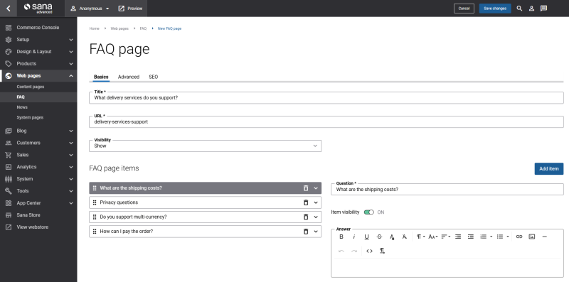 To create an FAQ page, in Sana Admin click: Web pages > FAQ.