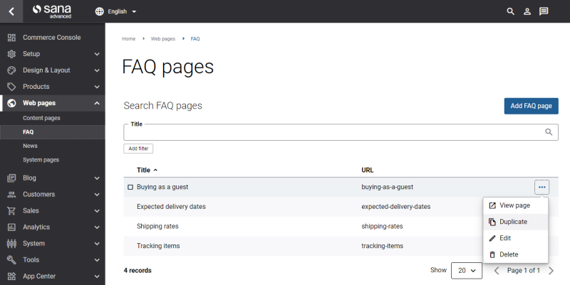 Here you can create a new FAQ page, edit, duplicate or delete an FAQ page, translate its content to any available language, copy to another webstore, view it in the webstore and set as a home page.