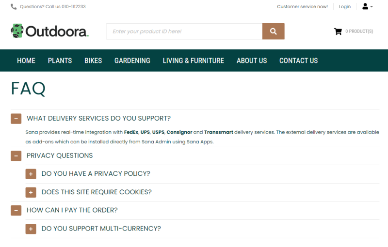 FAQ (frequently asked questions) page type is used to make a list of questions and answers, which provides a better understanding of a particular topic. The FAQ page is very useful for listing the most common questions and answers about your webstore. For example, you can provide information about which payment and shipping methods are supported by your webstore, are there any discounts or special offers.