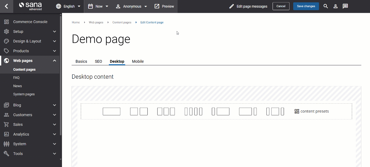 Rows and columns are at the very core of the Sana content management system and its visual designer. They allow you to work with any page layout and content you need. You can use rows and columns to create the page structure of any complexity and fill it with different content elements.