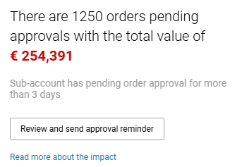 Sana Commerce Cloud provides an action signal widget for e-commerce managers in Sana Admin that shows the total monetary value of all orders pending approval.