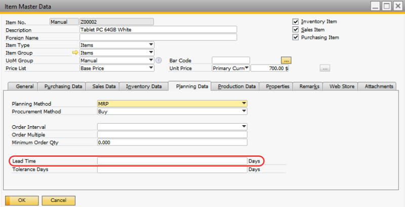 In SAP Business One click: Inventory > Item Master Data. Open a necessary item. In the Item Maintenance window, on the Planning Data tab, use the Lead Time field to set the lead time for an item.